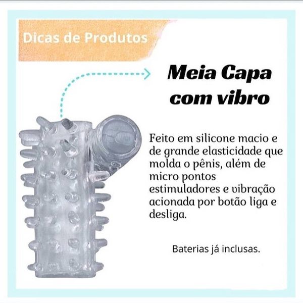 Meia Capa Peniana com Vibro e Estimuladora – Quer sentir mais prazer? Essa Capa Penina é uma excelente escolha para a sua relação sexual se ainda mais intensa, ela tem estimuladores em todo o seu contorno que massageia e estimula ainda mais a penetração. Ela é confeccionada em um silicone super macio e que se molda em qualquer tamanho de Pênis. Ela deixa a glande do pênis exposta. Ela com certeza não é somente para dar prazer para as mulheres ela também oferece várias sensações novas, e o motivo é que quando vestidas ela aumenta o diâmetro do pênis e mantem ele mais firme o que causa um atrito ainda maior quando ocorre a penetração, a glânde reconhece ainda mais o atrito e contribui com essas novas sensações. Ela contém botão de liga e desliga para o vibro. Contém: 1 unidade de cores diversas.