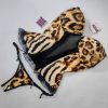 O espartilho com estampa de onça é feito em tule com acabamento em cetim, com bojo e um detalhe em tule preto na parte frontal da peça, e a calcinha no modelo fio dental.